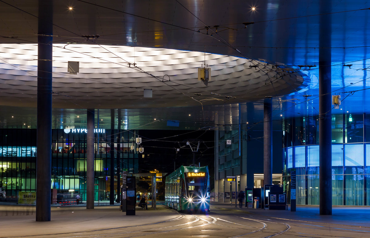 Flexity 5033 der Basler Verkehrs-Betriebe steht als Linie 6 nach Allschwil Dorf an der Haltestelle Messeplatz