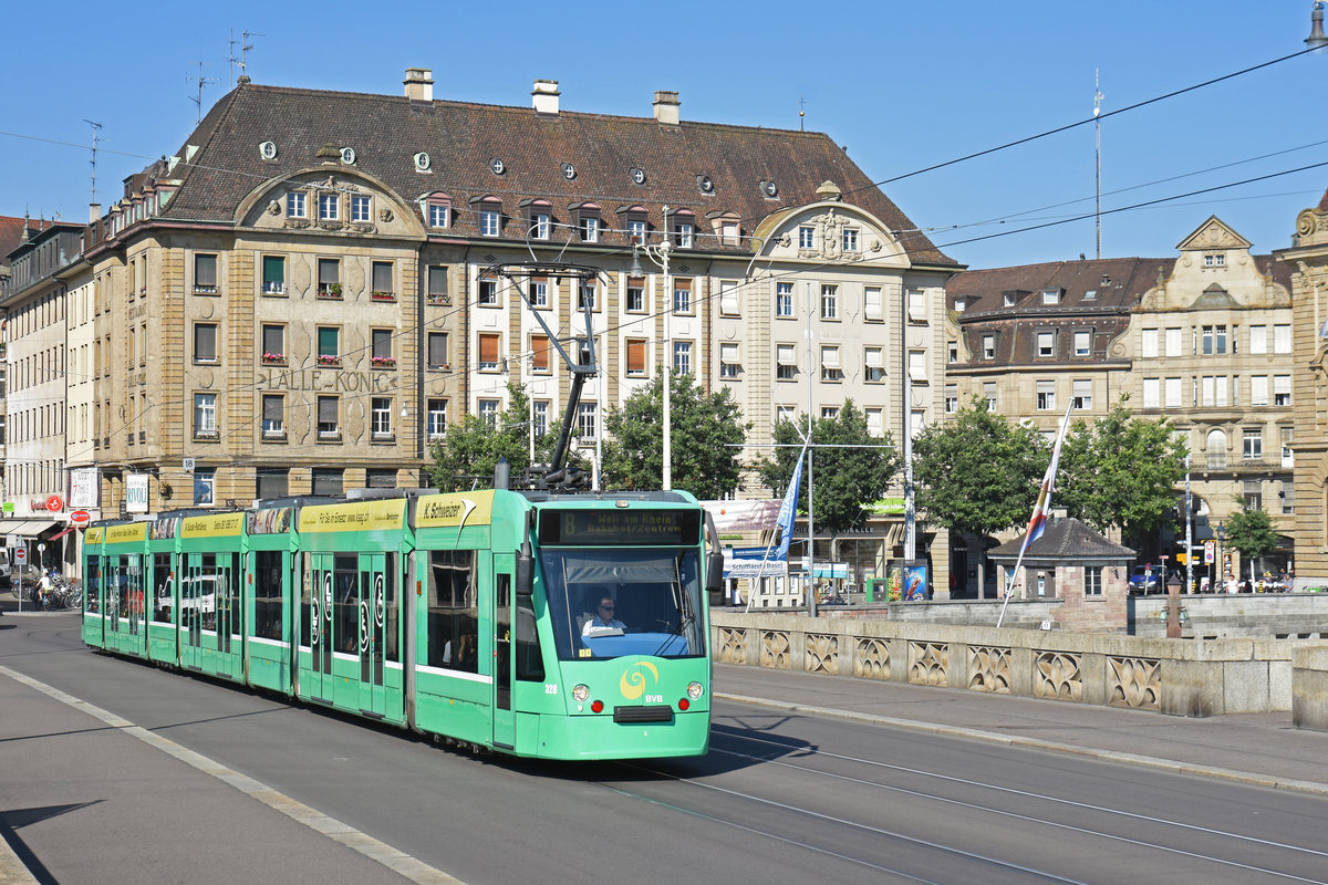 Be 6/8 Combino 328, auf der Linie 8, überquert die Mittlere Rheinbrücke Die Aufnahme stammt vom 20.06.2018.