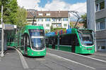 Be 4/6 Flexity 6011 mit der Werbung für die Konfitüre von Zuegg, auf der wegen einer Baustelle umgeleiteten Linie 3, fährt am 07.04.2026 zur Haltestelle am Aeschenplatz. Aufnahme Basel.