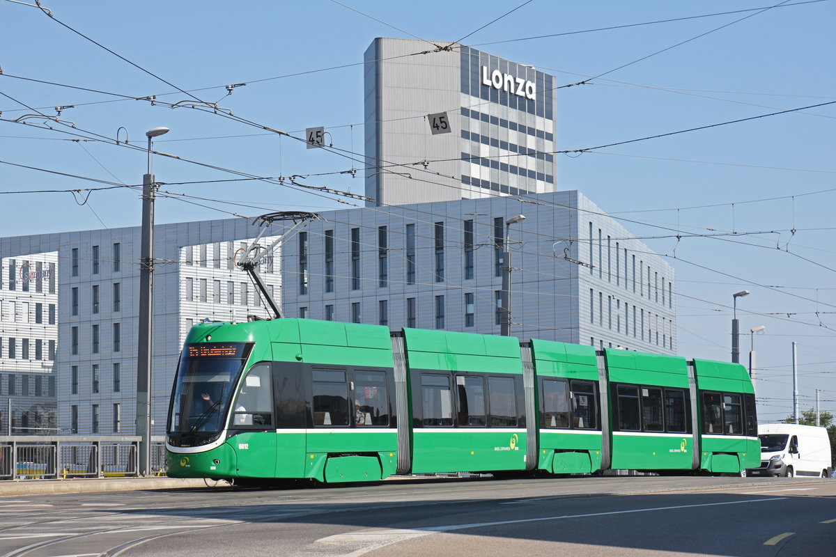 Be 4/6 Flexity 6012, auf der Linie 15, überquert die Münchensteinerbrücke.
