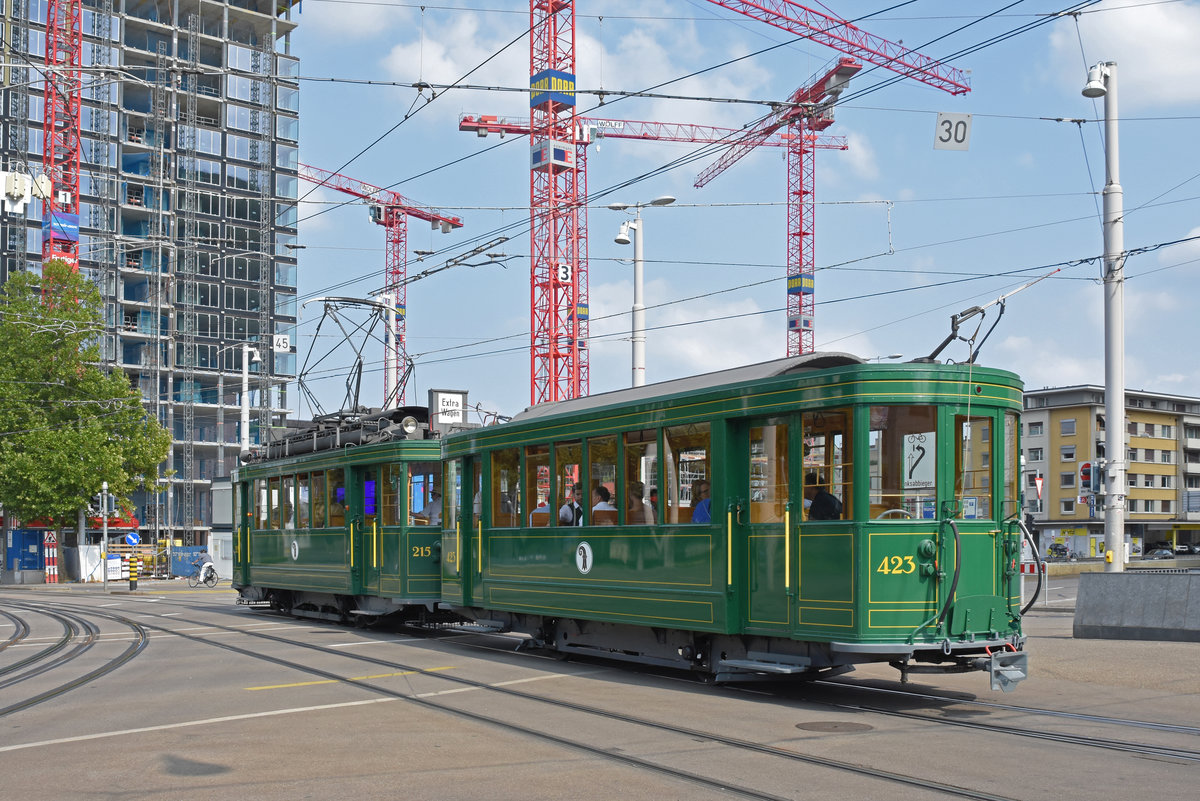 Be 2/2 215 zusammen mit dem B2 423 fährt vom Bahnhof SBB Richtung Aeschenplatz.