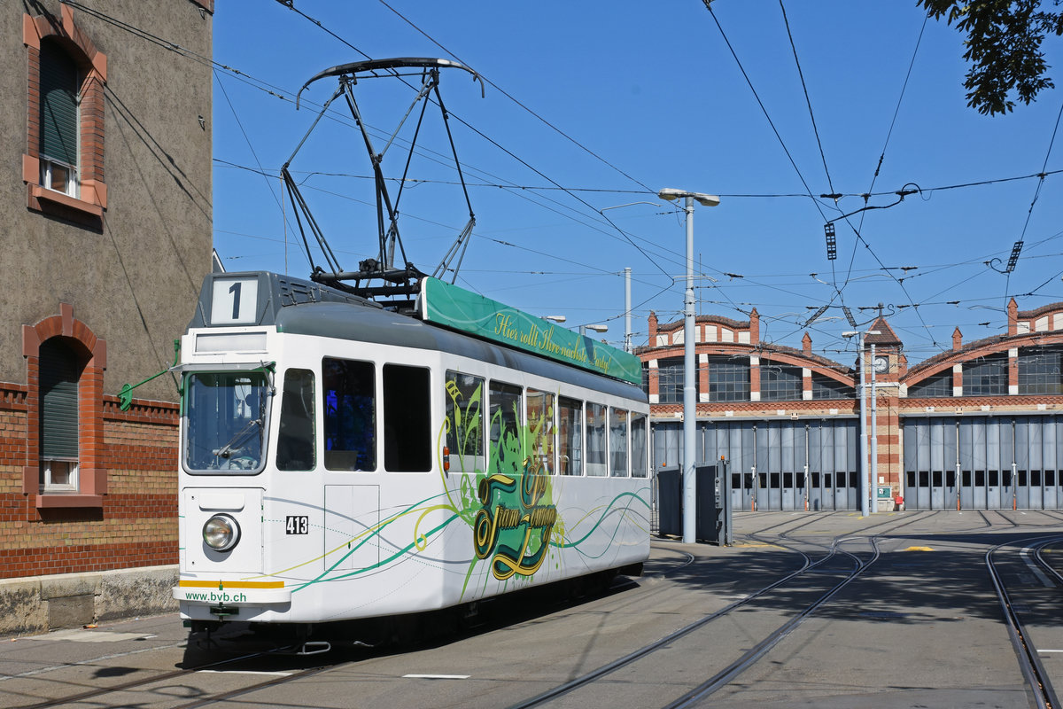 Am 08.09.2018 war in der Hauptwerkstatt Tag der offenen Tür. Der Tramclub Basel fuhr mit vier Kursen eine Oldtimer Linie. Hier wartet der Be 4/4 413 Tram Lounge beim Depot Wiesenplatz auf die nächste Abfahrtszeit.