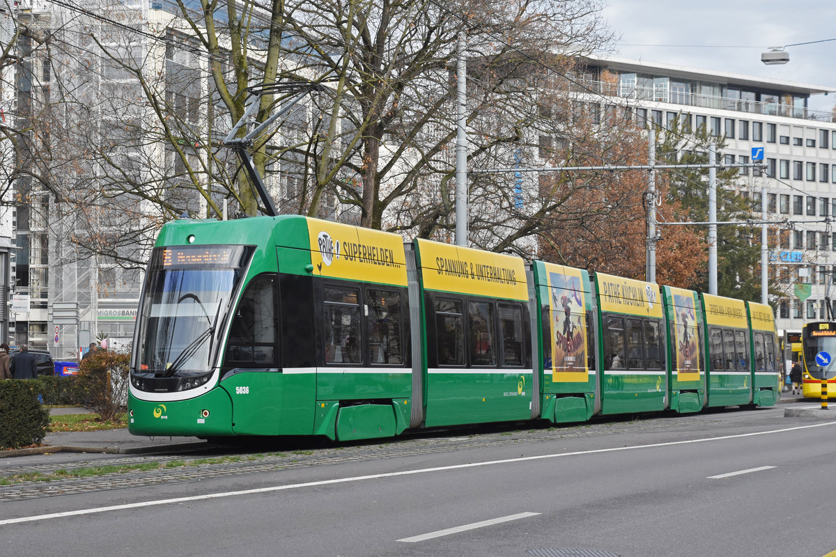 Be 6/8 Flexity 5036, auf der Linie 8, fährt Richtung Haltestelle Bahnhof SBB. Die Aufnahme stammt vom 05.12.2018.