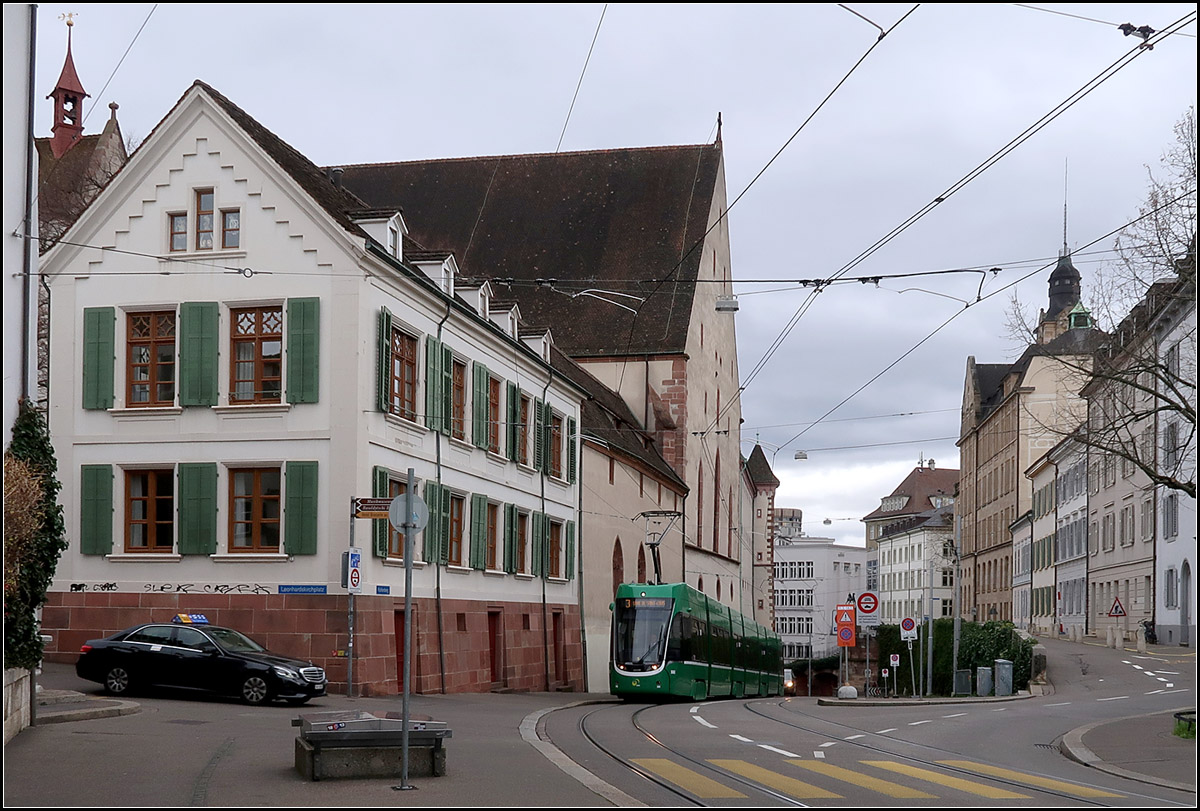 Die Basler Felcity II-Tram erreicht am Ende der Steigungsstrecke am Kohlenberg gleich die Haltestelle Musikakademie.