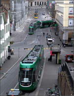 Combino-Tram, B4-Anhänger und Felity II-Straßenbahn am Messeplatz in Basel.