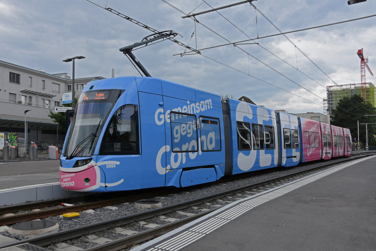 Be 6/8 Flexity 5004 "Gemeinsam gegen Corona", auf der Linie 14, wartet an der Endstation in Pratteln. Die Aufnahme stammt vom 24.07.2021.