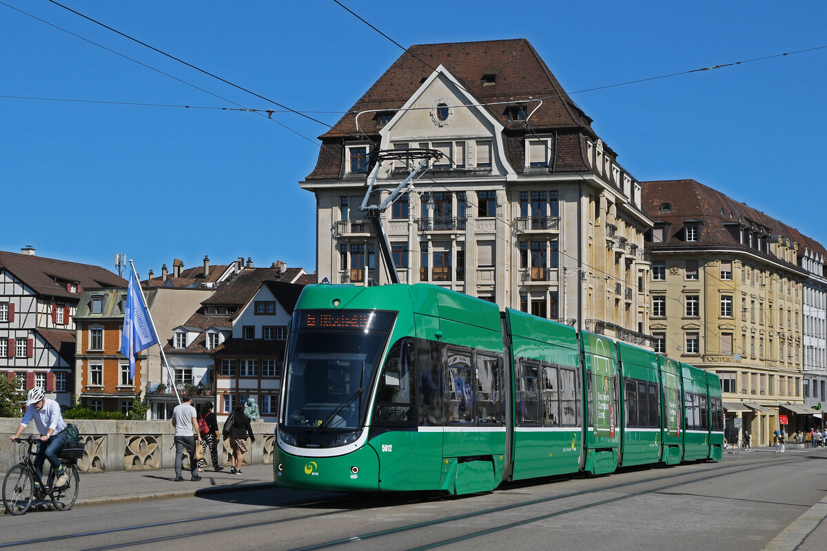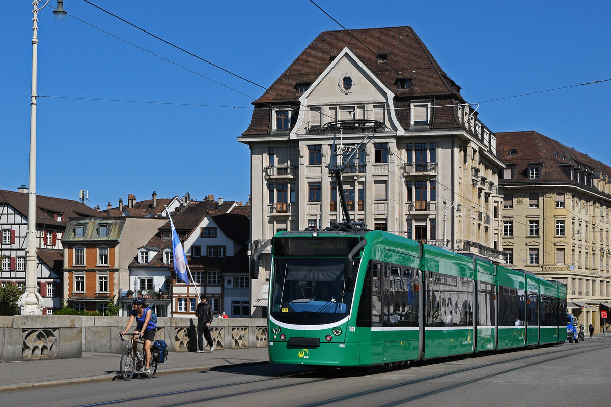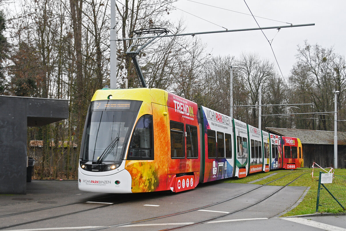 Be 6/8 Flexity 5003 mit der Werbung für den Wohnpark Binzen, auf der Linie 2, wartet am 08.12.2025 in der Schlaufe beim Eglisee. Aufnahme Basel. Markus Wagner
