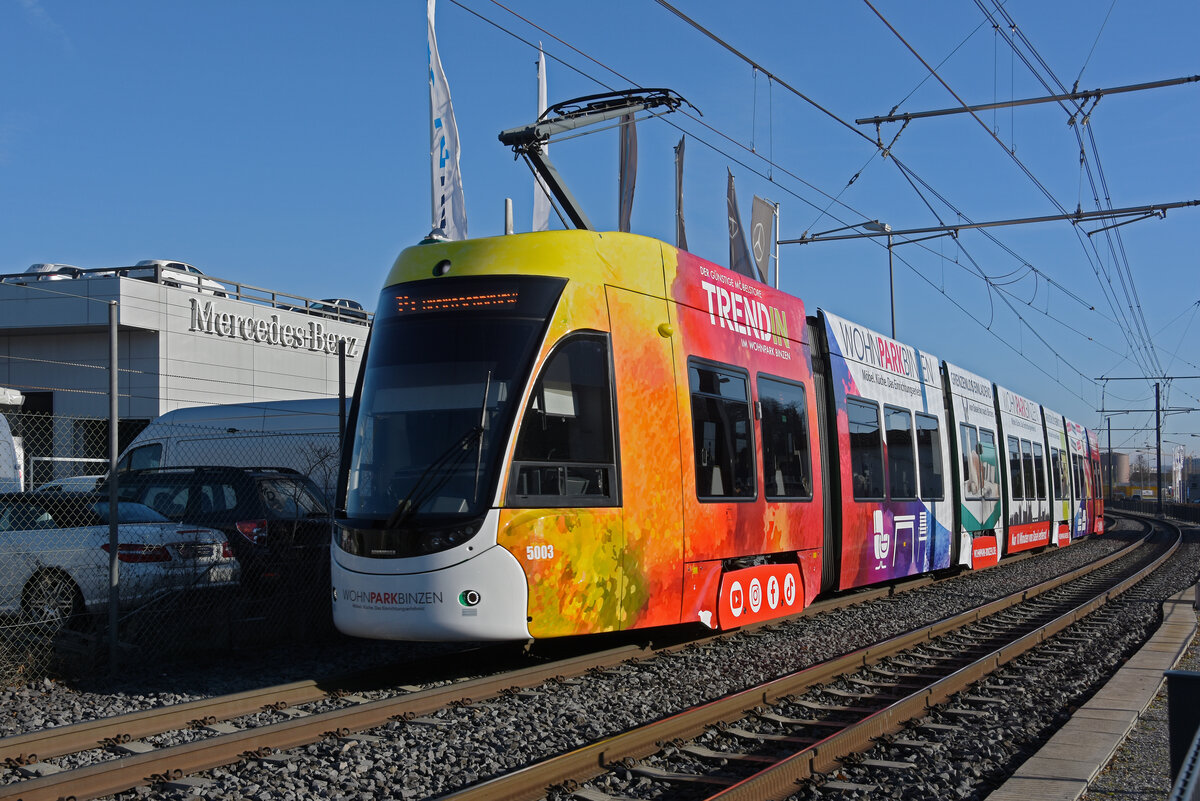 Be 6/8 Flexity 5003 mit der Werbung für den Wohnpark Binzen, auf der Linie 14, fährt am 15.12.2025 zur Haltestelle Lachmatt. Aufnahme Pratteln.