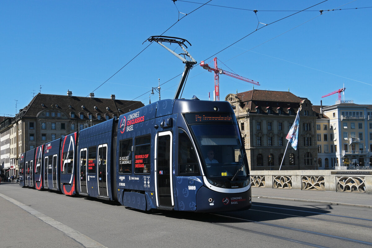 Be 6/8 Flexity 5009 mit der Werbung für einem Pferdeanlass im St. Jakob, auf der Linie 14, fährt am 23.03.2026 zur Haltestelle St. Jakob. Aufnahme Basel.