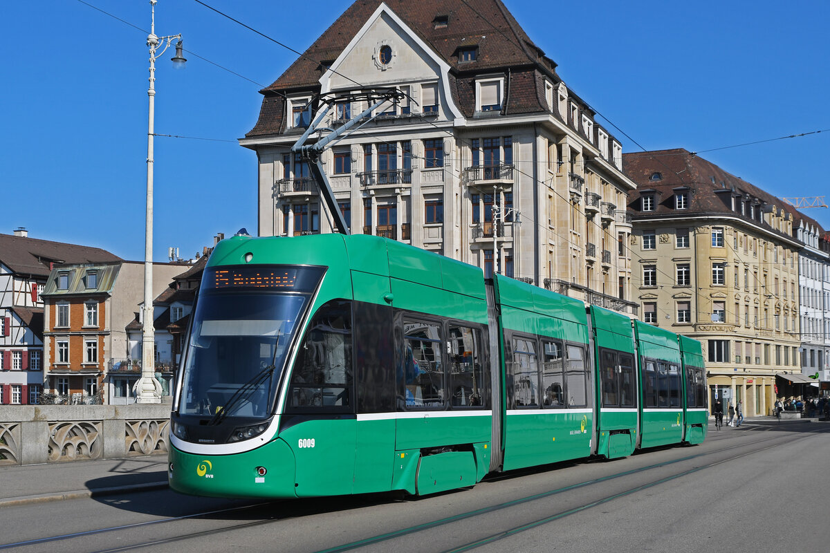 Be 4/6 Flexity 6017, auf der Linie 3,bedient am 01.03.2023 die Haltestelle St. Alban Tor.