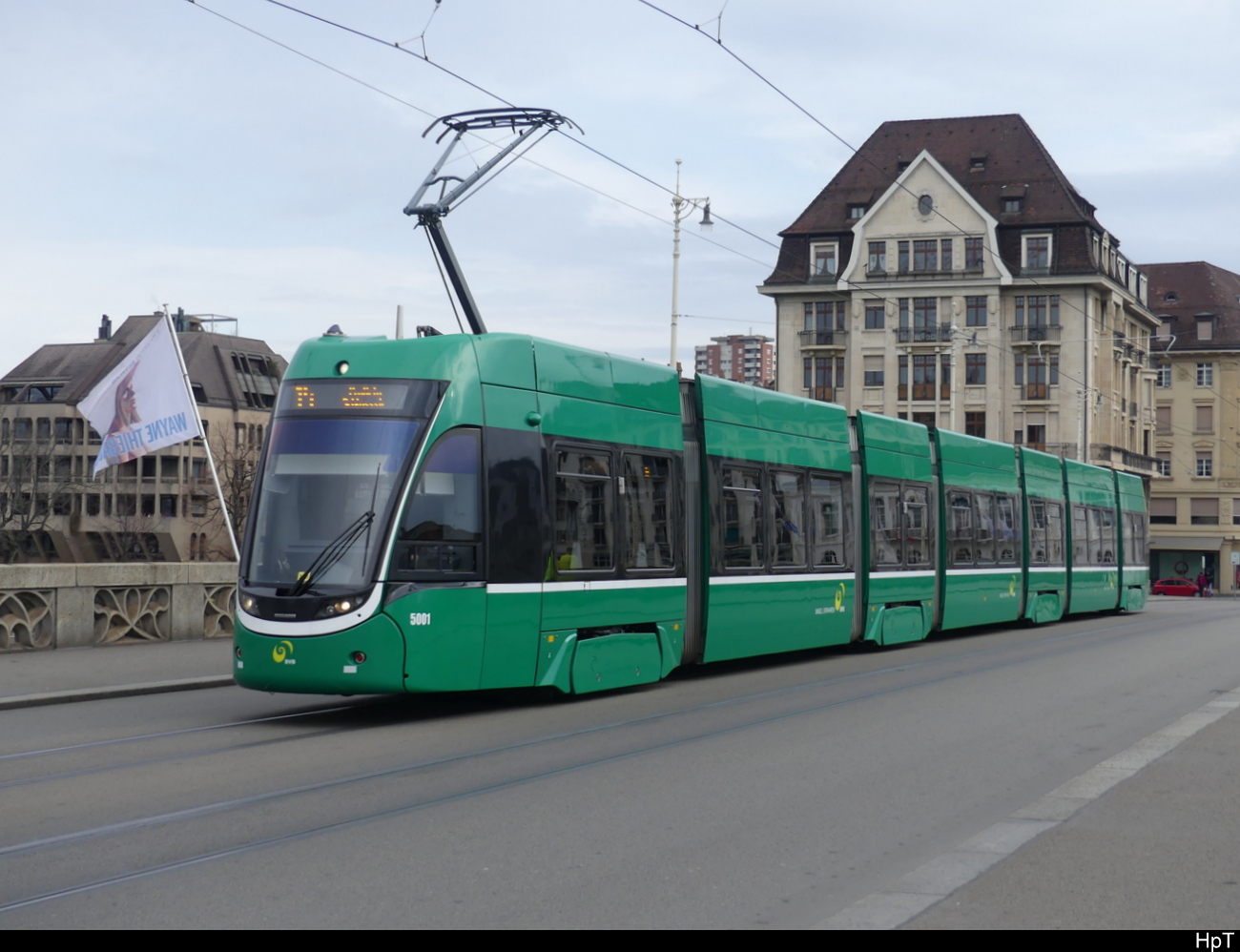 BVB - Tram Be 6/8 5001 unterwegs auf der Mittleren Rheinbrücke am 19.03.2023