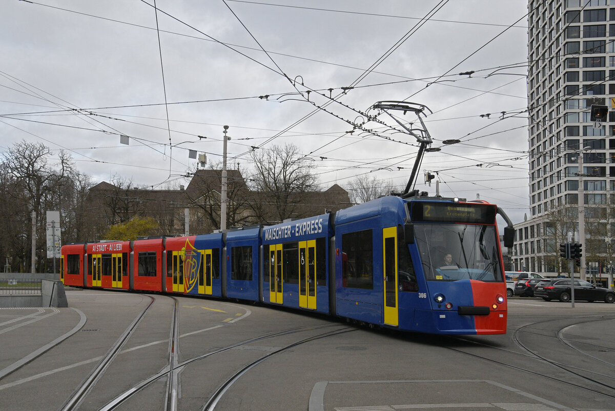 Be 6/8 Combino 306 FC Basel, auf der Linie 2, fährt am 23.02.2026 bei der Haltestelle Bahnhof SBB ein. Aufnahme Basel.