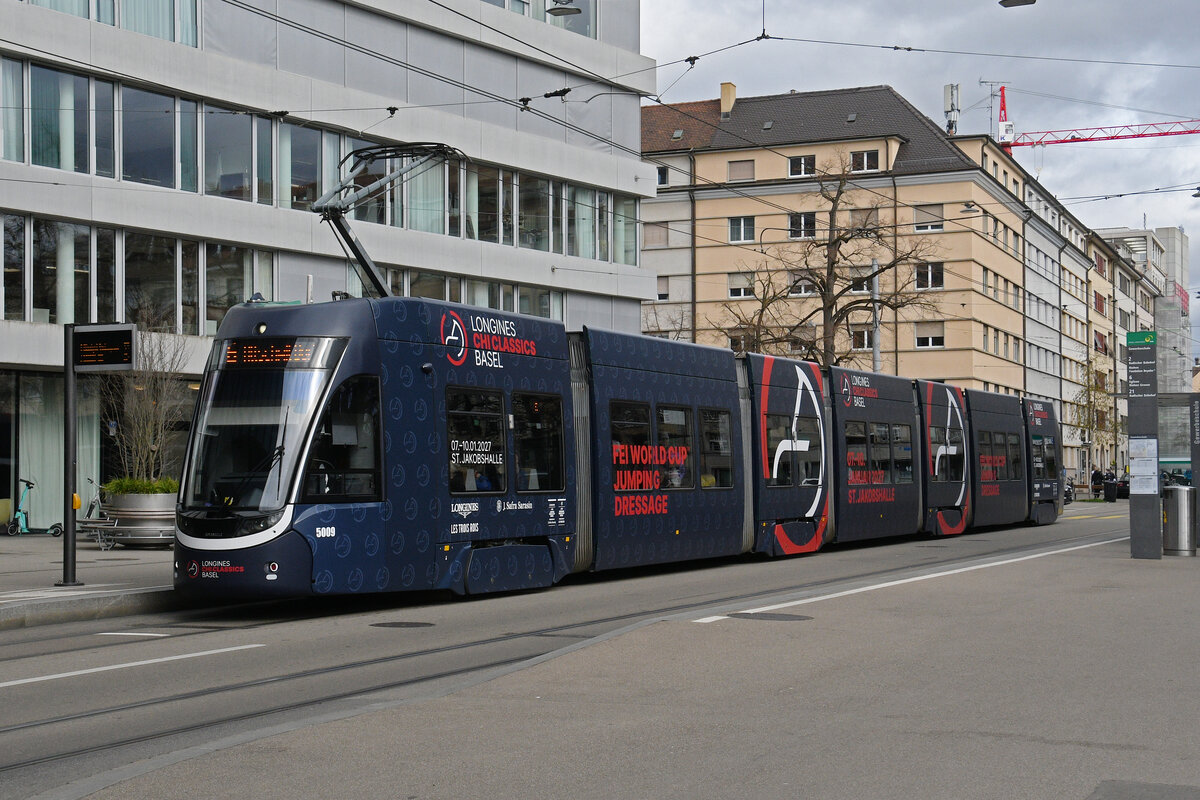 Be 6/8 Flexity 5009 mit der Werbung für einen Pferdeanlass in der St. Jakobs Halle, auf der Linie 6, bedient am 23.02.2026 die Haltestelle Gewerbeschule. Aufnahme Basel.