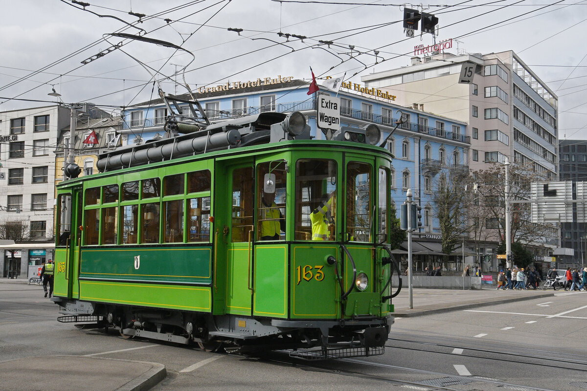Ce 2/2 163 verlässt am 23.02.2026 die Haltestelle am Bahnhof SBB und dient dem Fasnachts-Comité während dem Cortège als Kontrollpunkt. Standorte sind die Wettsteinbrücke und der Theaterbogen beim Steinenberg. Als zweiter Oldtimer kommt 2026 der Ce 2/2 190 zum Einsatz. Aufnahme Basel.