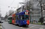 Be 4/4 494 zusammen mit dem B4S 1492, auf der Linie 15 wendet während der Basler Fasnacht am Aeschenplatz. Hier fährt der Wagen am 01.03.2023 zur Endstation am Aeschenplatz.