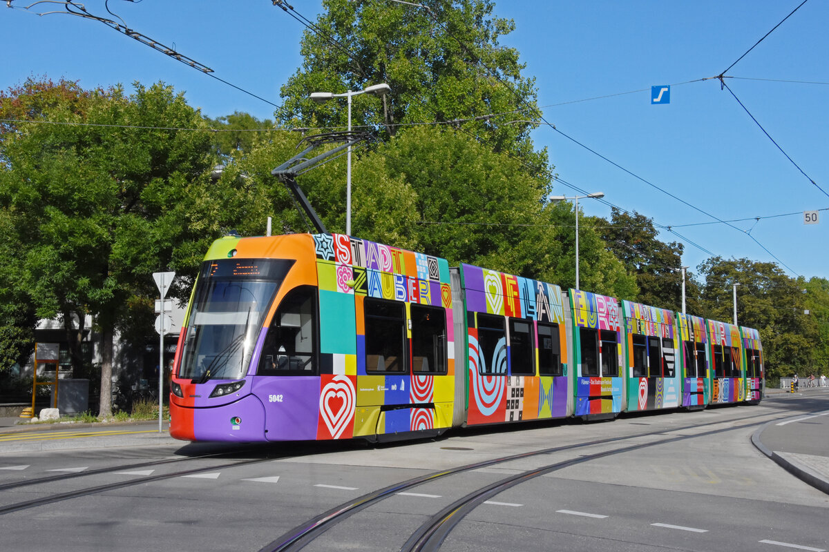 Be 6/8 Flexity 5042 "Flaneur Stadt Zauber", auf der Linie 2, verlässt am 12.09.2022 die Haltestelle ZOO Dorenbach.
