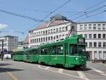 Be 4/6 Flexity 6011 mit der Werbung für die Konfitüre von Zuegg, auf der wegen einer Baustelle umgeleiteten Linie 3, fährt am 07.04.2026 zur Haltestelle am Aeschenplatz. Aufnahme Basel.