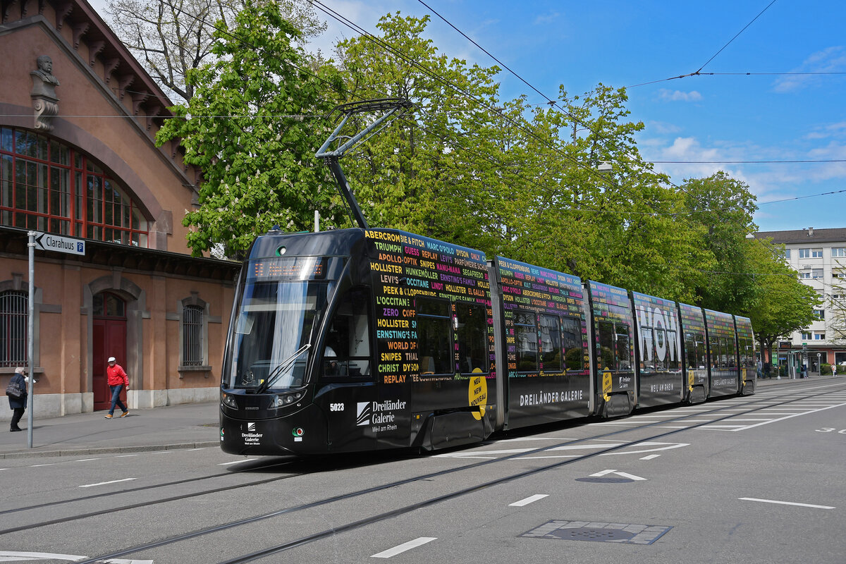Be 6/8 Flexity 5023 mit der Werbung für die Dreiländer Galerie, auf der Linie 8, fährt am 21.04.2023 zur Haltestelle Claraplatz.