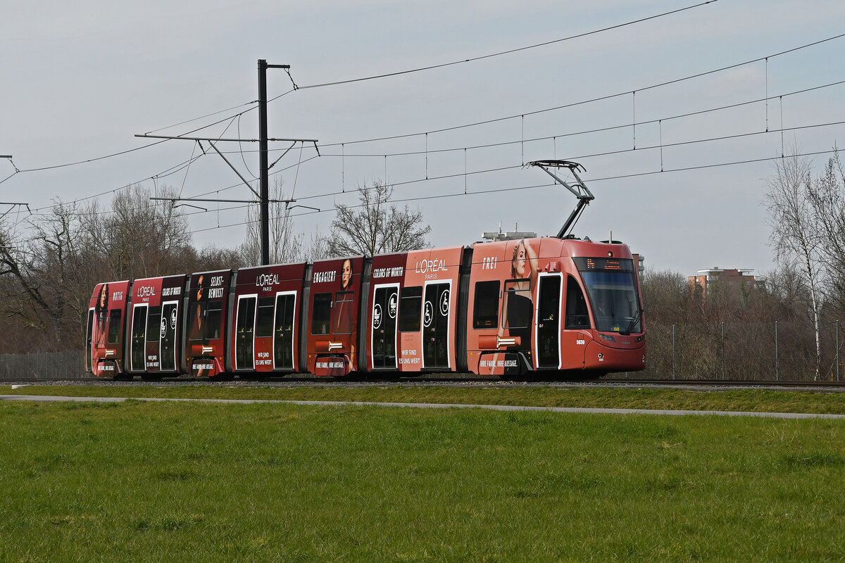 Be 6/8 Flexity 5030 mit der L'oréal Paris Werbung, auf der Linie 14, fährt am 07.03.2023 zur Haltestelle Lachmatt.