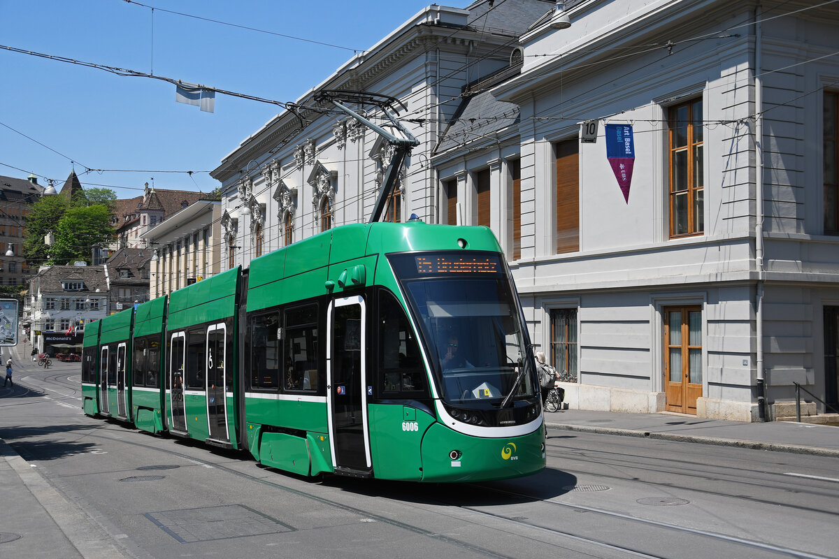 Be 4/6 Flexity 6006, auf der Linie 15, fährt am 14.06.2023 den Steinenberg hoch zur Haltestelle Bankverein.