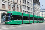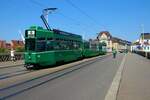 Be 6/8 Flexity 5025, auf der Linie 1, überquert am 19.04.2023 die Dreirosenbrücke.