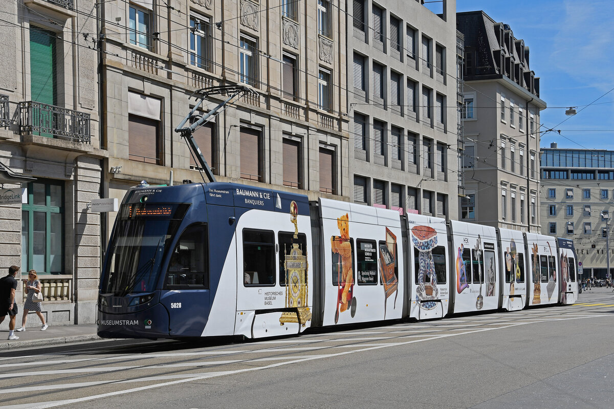 Be 6/8 Flexity 5028 mit der Werbung für die Basler Museen, auf der Linie 1, fährt am 02.09.2023 durch die Centralbahnstrasse zur Haltestelle Markthalle.