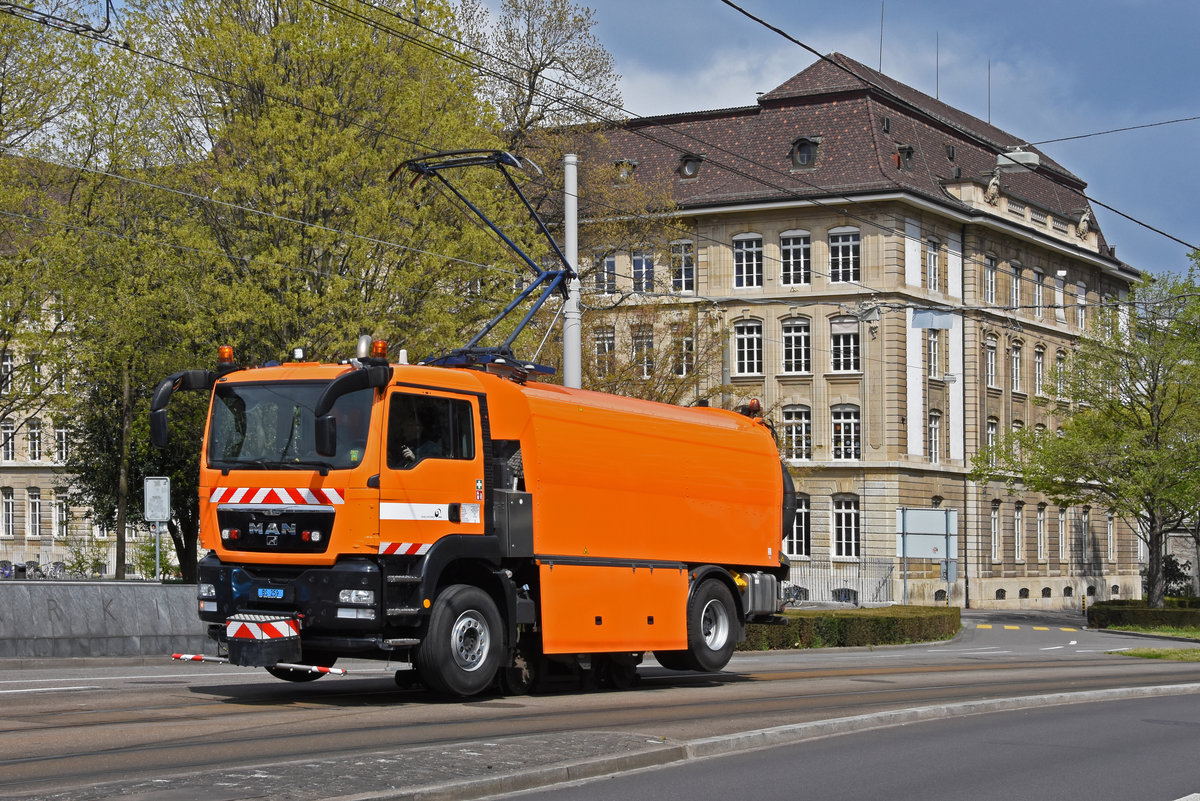 MAN Schienenreiniger 2827 reinigt am 24.01.2024 bei der Haltestelle Peter Merian die Geleise. Der Pantograf dient zum ansteuern von Weichen und Signalen. Während der MAN auf der Lore fährt, gelten alle Vorschriften für Tram Züge.