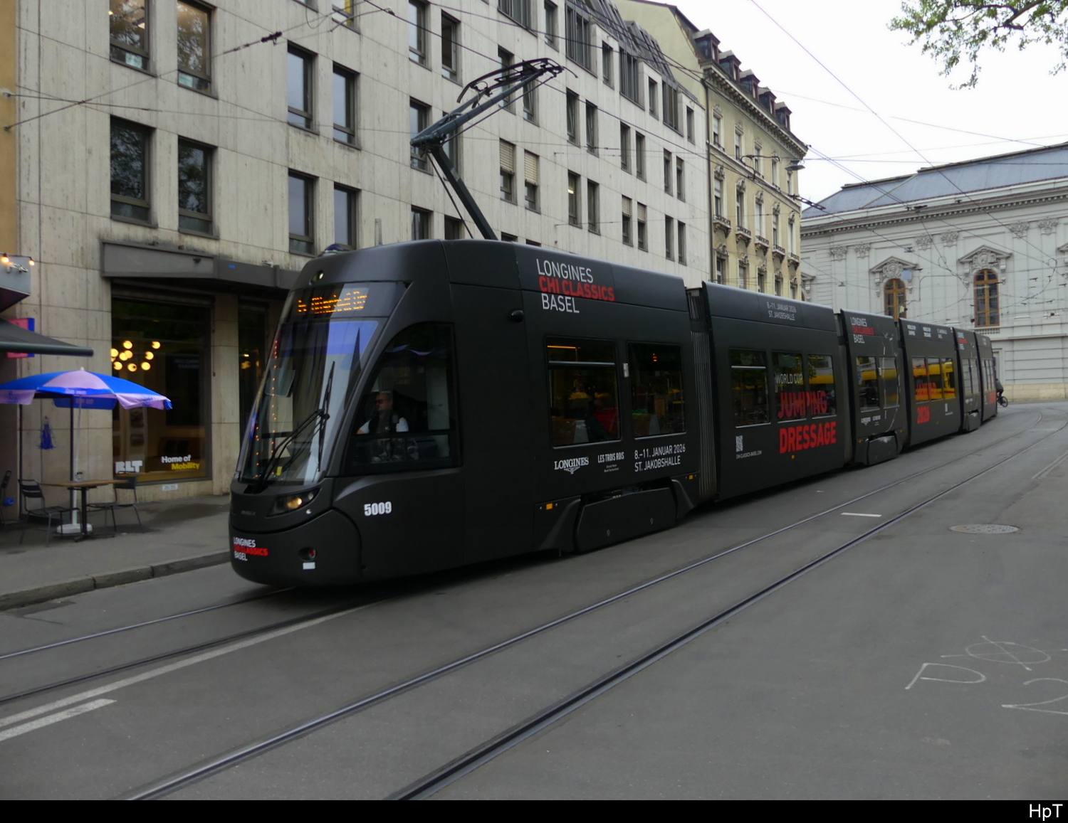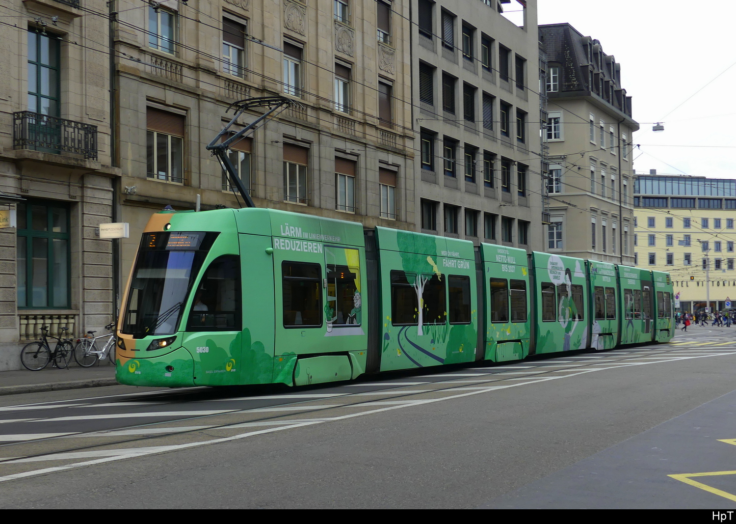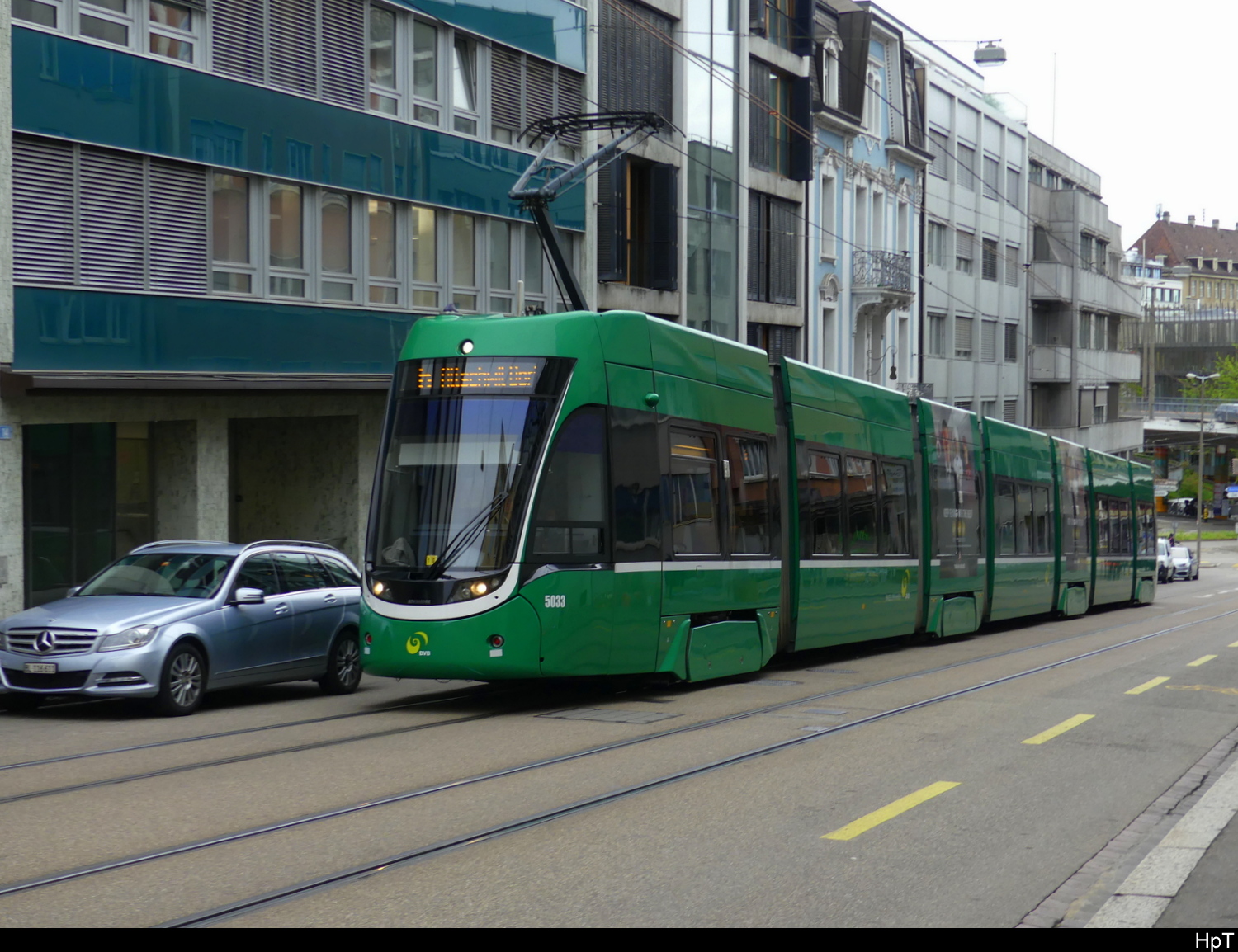 Be 4/6 6011 mit der Werbung für die Raiffeisen Bank, auf der wegen der gesperrten Margarethenbrücke umgeleiteten Linie 16, fährt am 19.02.2024 zur Haltestelle am Aeschenplatz.
