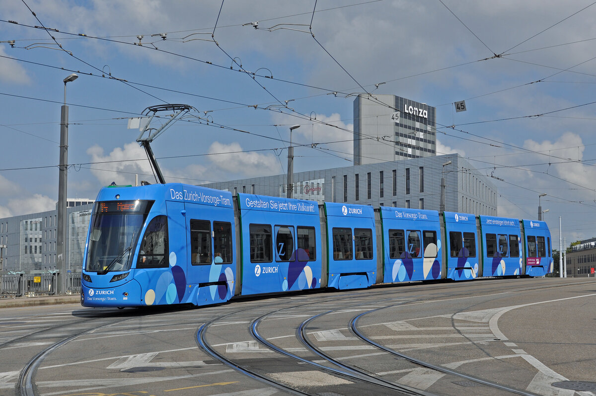 Be 6/8 Flexity 5022 mit der Werbung für die Zürich Versicherung, auf der wegen einer Grossbaustelle zwischen Hardstrasse und Pratteln umgeleiteten Linie 14, überquert am 19.08.2024 die Münchensteinerbrücke. Aufnahme Basel.