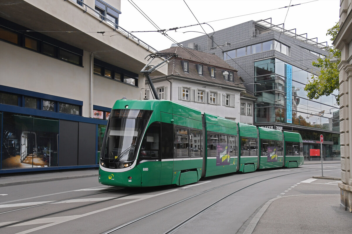Be 4/6 Flexity 6005, auf der Linie 16, fährt am 16.09.2024 zur Haltestelle Theater. Aufnahme Basel.
