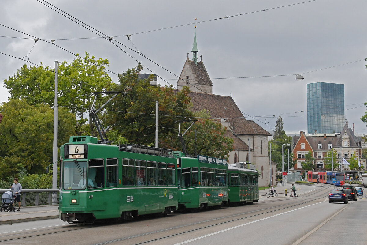 Doppeltraktion, mit den Be 4/4 477 und 491 zusammen mit dem B4S 1495, auf der wegen einer Baustelle umgeleiteten Linie 6, überquert am 10.09.2024 die Wettsteinbrücke. Aufnahme Basel.