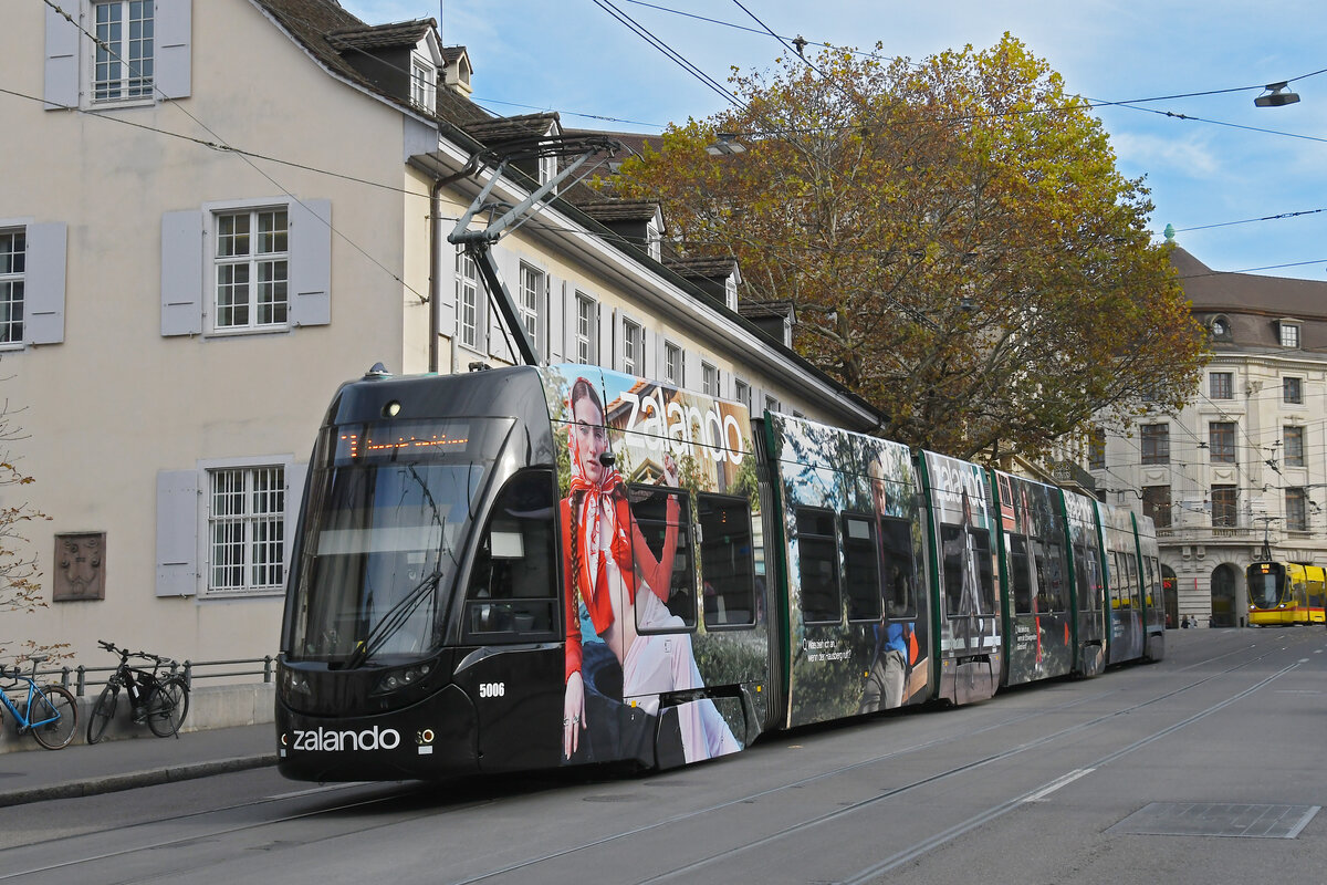 Be 6/8 Flexity 5006 mit der Zalando Werbung, auf der Linie 3, fährt am 18.11.2024 den Steinenberg hinunter zur Haltestelle Barfüsserplatz. Aufnahme Basel.