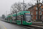 Be 4/6 Flexity 6011 mit der Werbung für die Konfitüre von Zuegg, auf der wegen einer Baustelle umgeleiteten Linie 3, fährt am 07.04.2026 zur Haltestelle am Aeschenplatz. Aufnahme Basel.