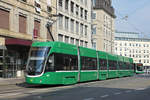 Be 4/6 Flexity 6011 mit der Werbung für die Konfitüre von Zuegg, auf der wegen einer Baustelle umgeleiteten Linie 3, fährt am 07.04.2026 zur Haltestelle am Aeschenplatz. Aufnahme Basel.