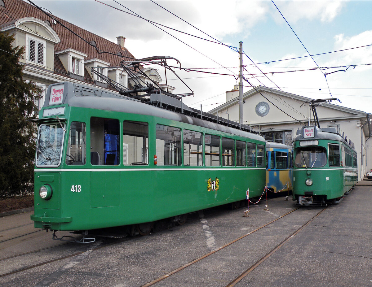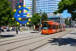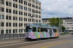 Während dem ESC in Basel fährt der Düwag 628 als Karaoke Drämmli durch die Stadt Basel. Am 12.05.2025 überquert der Wagen mit der Ricola Werbung die Dreirosenbrücke. Aufnahme Basel.
