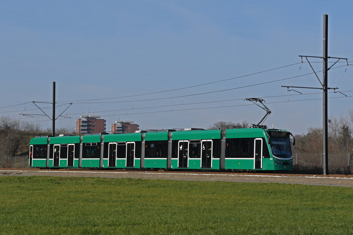 Be 4/6 Flexity 6011 mit der Werbung für Zuegg Konfitüre, auf der Linie 15, überquert am 21.03.2026 die Münchensteinerbrücke. Aufnahme Basel.