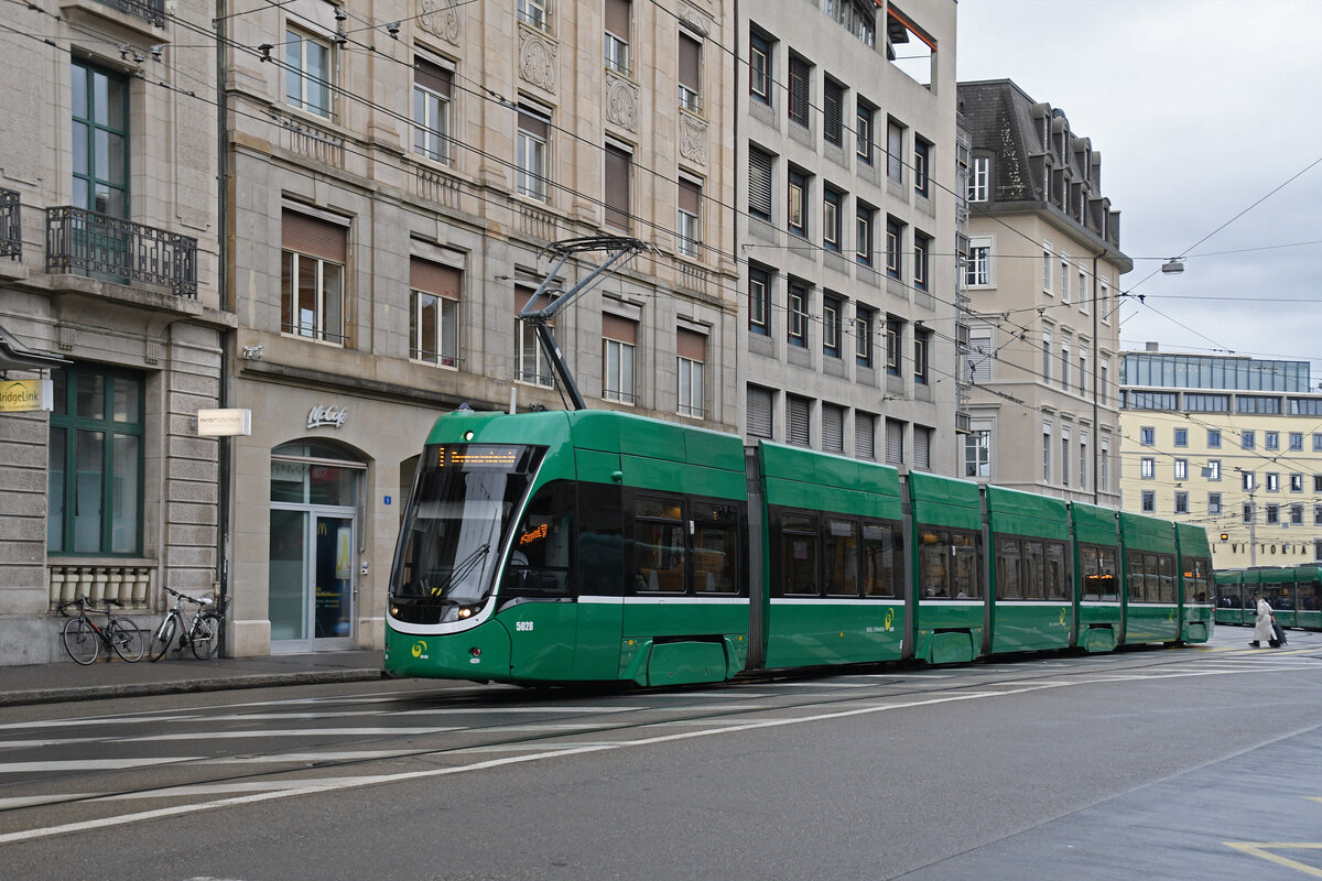 Be 6/8 Combino 312, auf der wegen einer Baustelle umgeleiteten Linie 8, bedient am 19.01.2026 die Haltestelle Peter Merian. Aufnahme Basel.