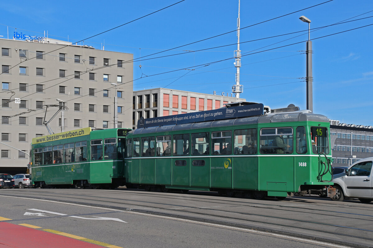 Be 4/4 483 zusammen mit dem B4S 1488, auf der Linie 15, überquert am 18.12.2025 die Münchensteinerbrücke. Aufnahme Basel.