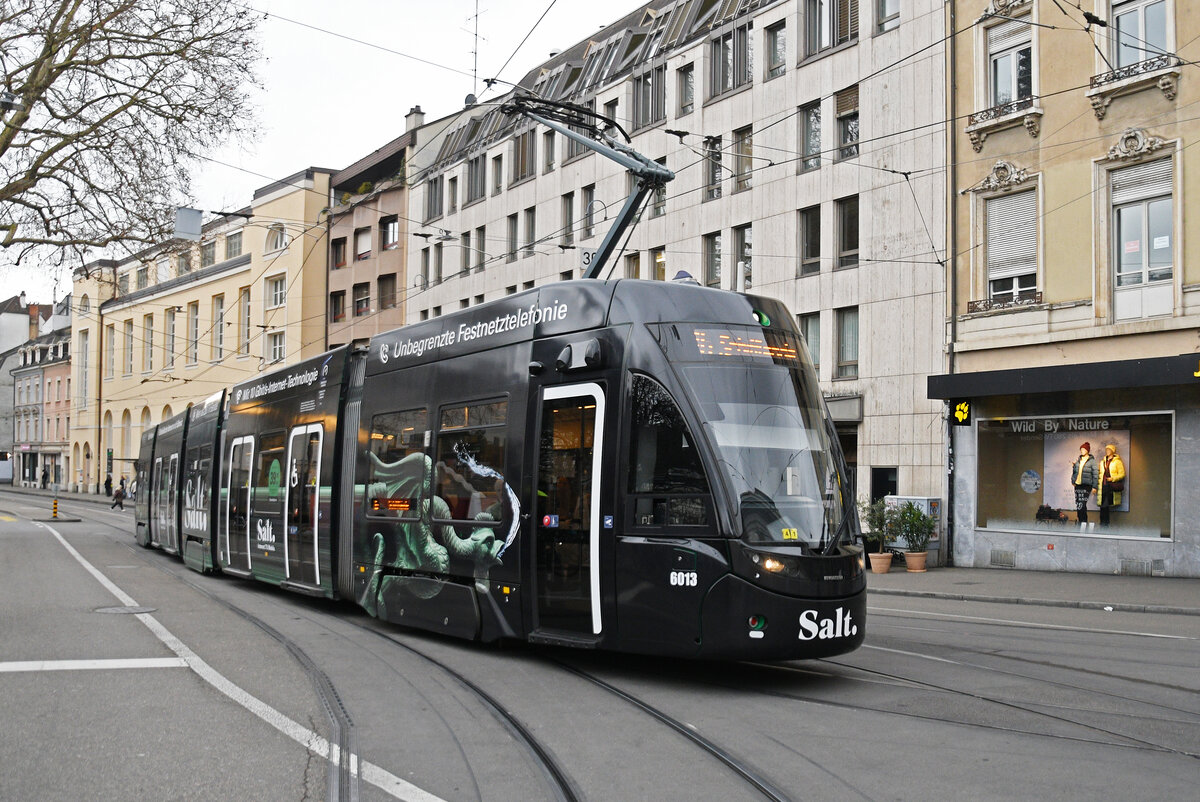 Be 4/6 Flexity 6013 mit der SALT Werbung, auf der Linie 16, verlässt am 22.12.2025 die Haltestelle Theater. Aufnahme Basel.