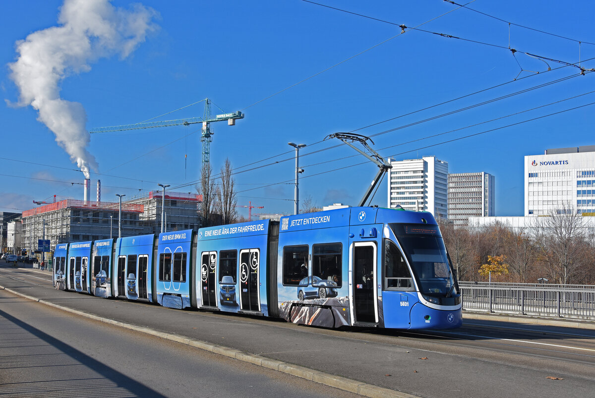 Be 6/8 Flexity 5031 mit der BMW Werbung, auf der Linie 1, verlässt am 18.11.2025 die Haltestelle Novartis Campus. Aufnahme Basel.