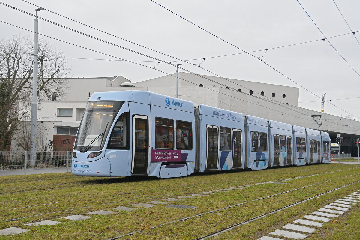 Be 6/8 Flexity 5022 mit der Werbung für die Zürich Versicherung, auf der Linie 14, fährt am 21.01.2026 zur Haltestelle St. Jakob. Aufnahme Basel. Markus Wagner