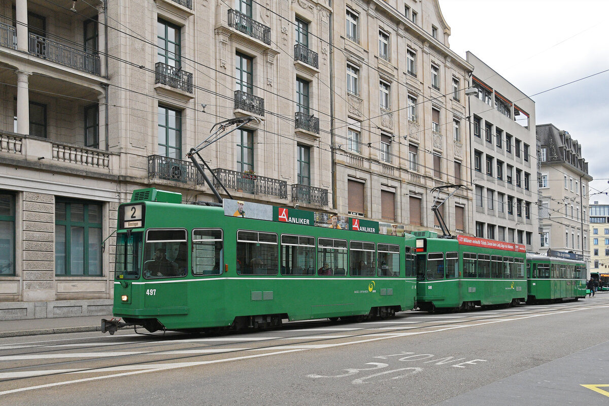 Doppeltraktion, mit den Be 4/4 497 und 500 zusammen mit dem B4S 1505, auf der Linie 2, fährt am 23.02.2026 zur Haltestelle Markthalle. Aufnahme Basel. Markus Wagner
