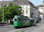 Nur auf der Linie 2 wird noch regelmässig eine Doppeltraktion mit den Düwag 624 und 652 eingesetzt. Die Aufnahme entstand am 04.07.2009 an der neuen Endhaltestelle in Binningen Kronenplatz.