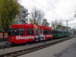 Be 4/6 Flexity 6011 mit der Werbung für die Konfitüre von Zuegg, auf der wegen einer Baustelle umgeleiteten Linie 3, fährt am 07.04.2026 zur Haltestelle am Aeschenplatz. Aufnahme Basel.