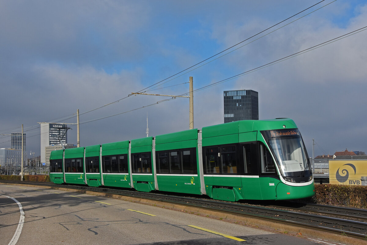 Be 6/8 Flexity 5044, auf der wegen einer Grossbaustelle umgeleiteten Linie 14, fährt am 18.11.2025 zur Haltestelle Münchensteinerstrasse. Aufnahme Basel.