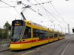 Ein Straßenbahn-Zug auf der Basler Dreirosenbrücke. Auf der unteren Brückenebene verläuft die Autobahn.