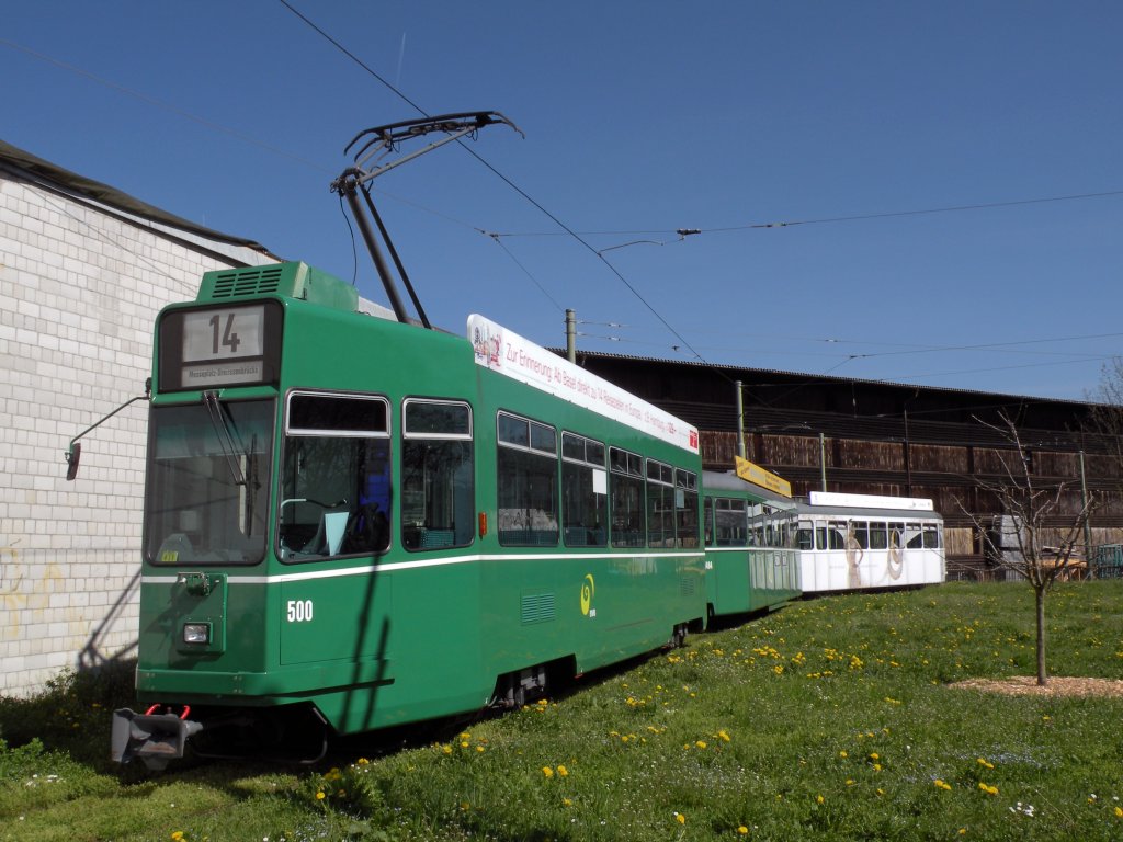 Be 4/4 500 mit B4 1484 und dem B4 1483, der noch die Vollwerbung für indischen Schmuck trägt, in der Schlaufe in Pratteln.