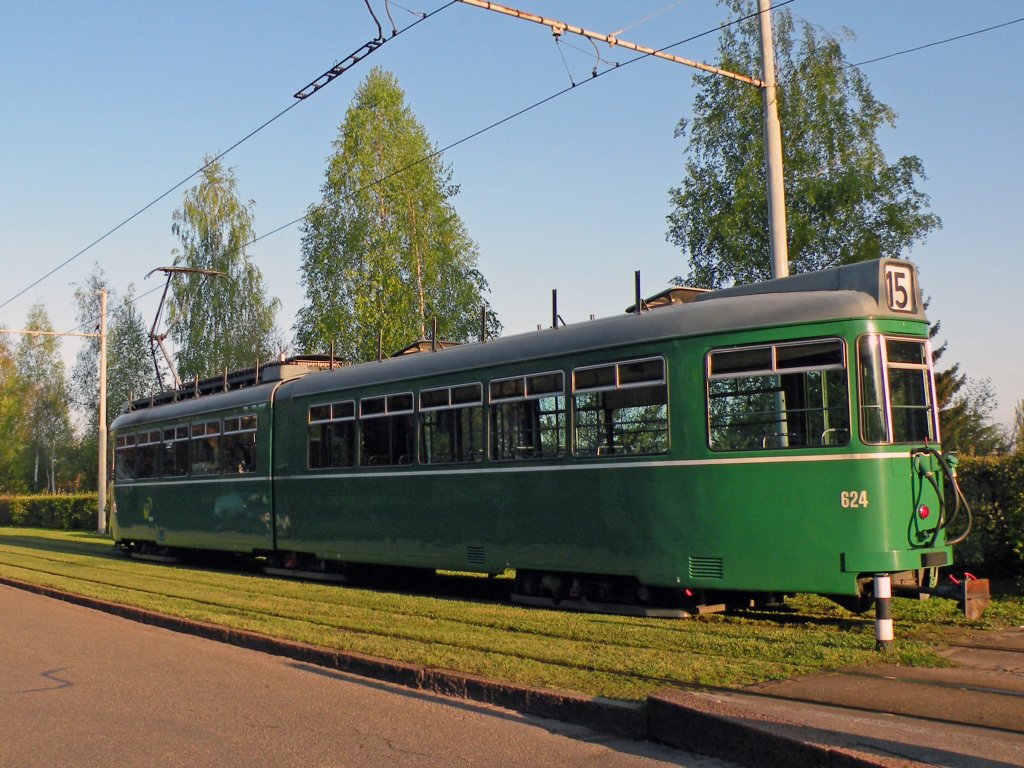 Nach einem Tramdefekt muss der Düwag 624 einen Einsatz auf der Linie 15 leisten. Hier fährt er von den ersten Sonnenstrahlen beleuchtet vom Brudeholz zur Basler Mustermesse. Die Aufnahme stammt vom 09.04.2011.