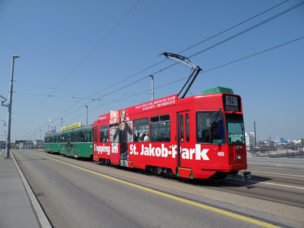 3 Wagenzug mit dem Be 4/4 495 mit Vollwerbung für den Einkaufstempel St.Jakob-Park an der Spitze auf der Dreirosenbrücke in Basel. Die Aufnahme stammt vom 22.04.2011.