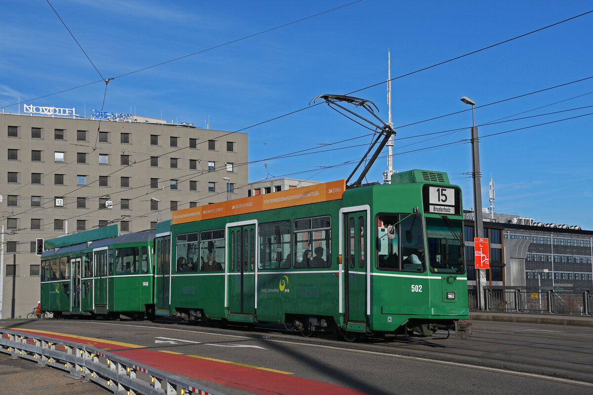 Be 6/8 Flexity 5002, auf der Linie 1, überquert am 11.11.2025 die Dreirosenbrücke. Aufnahme Basel.